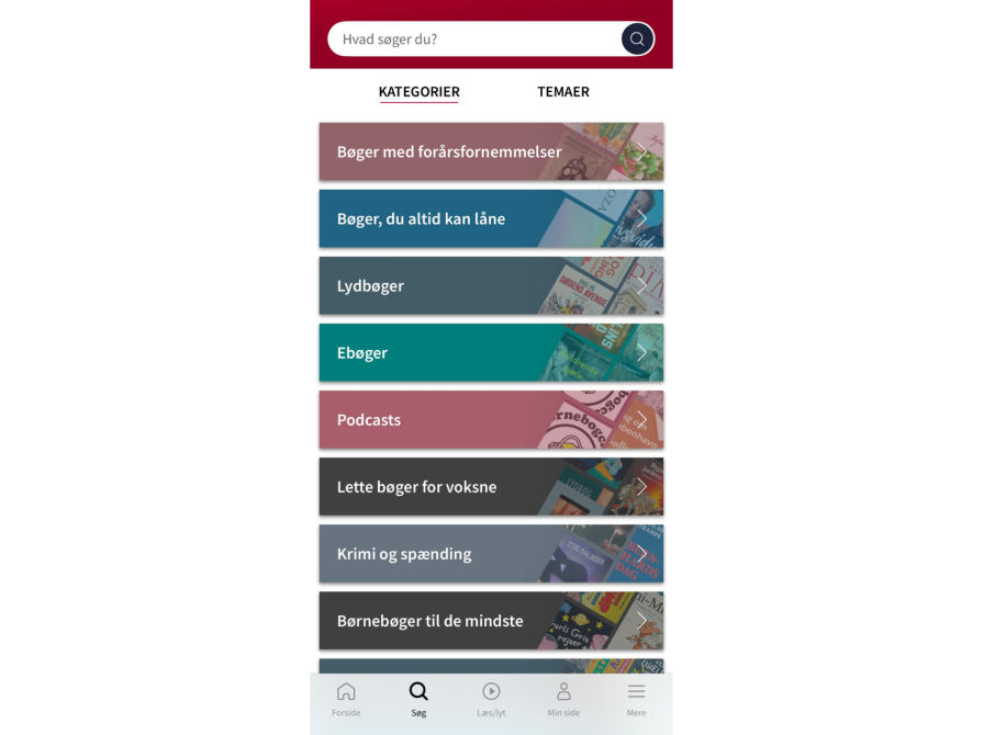 Ønsker du at gå på opdagelse i alle vores blå titler, kan du trykke på "Søg" i bundmenuen. Her finder du alle eReolens inspirationssider, og på siden "Bøger, du altid kan låne" anbefaler vi de bedste og nyeste blå titler. Scroller du ned i bunden af denne side, kan du også få vist en samlet liste over alle eReolens blå titler.